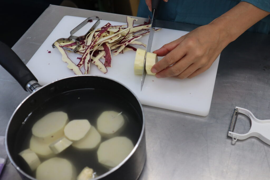 - さつまいもの皮をむいて一口大に切り、5分水にさらします。