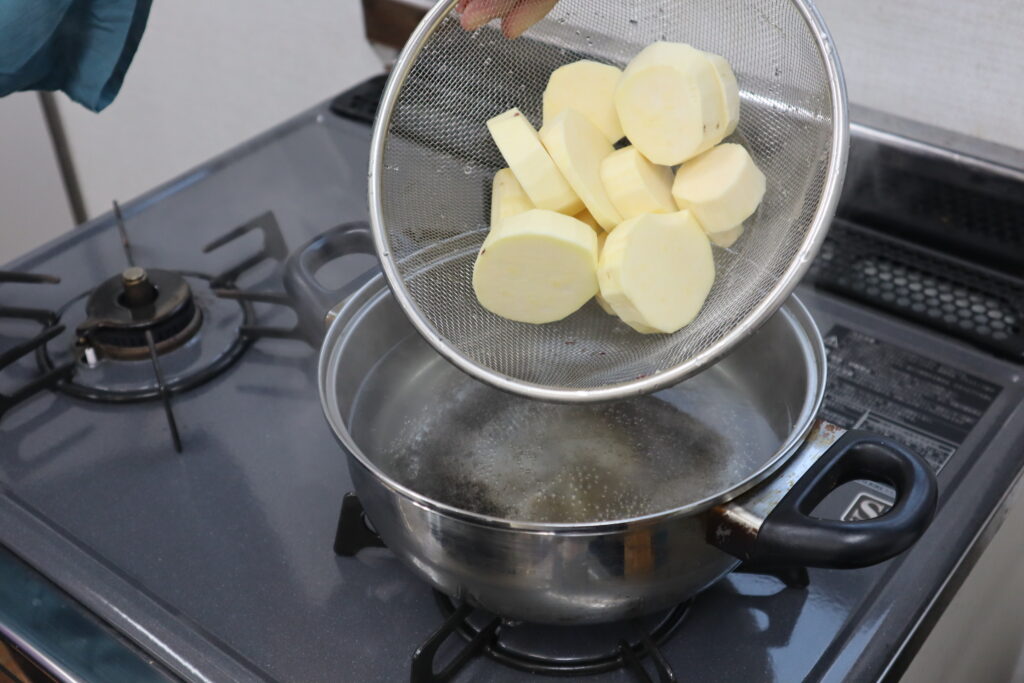 - お鍋に水とさつまいもを入れ、沸騰直前で弱火にして5~10分ほど茹でます。竹串がスッと通ればOK。