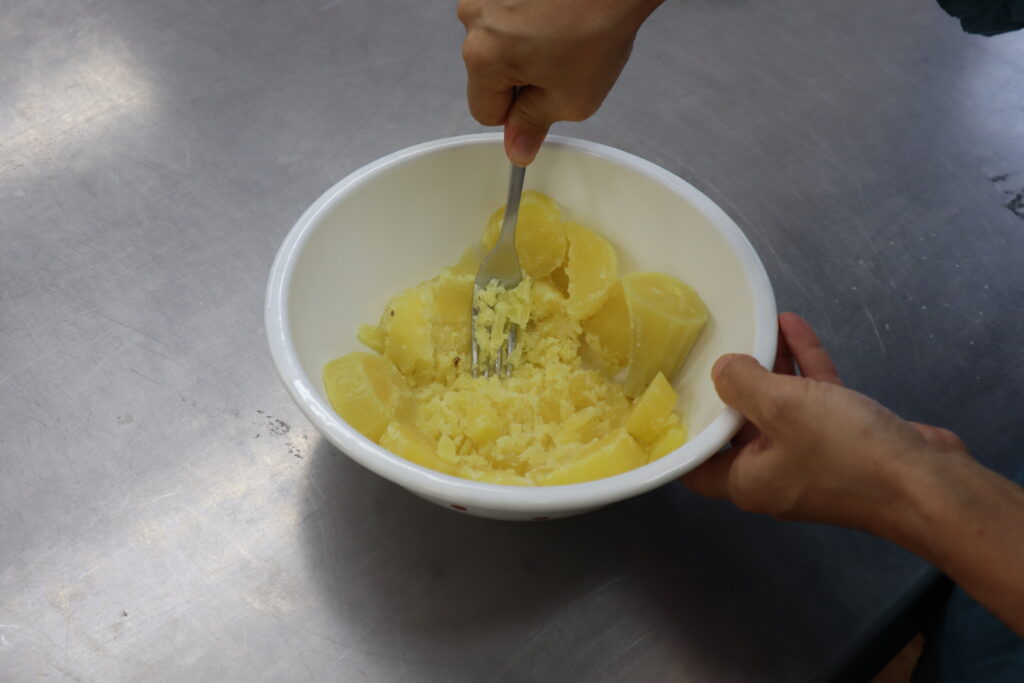 - ザルにあげて水切りし、マッシャーかフォークの背でつぶします。