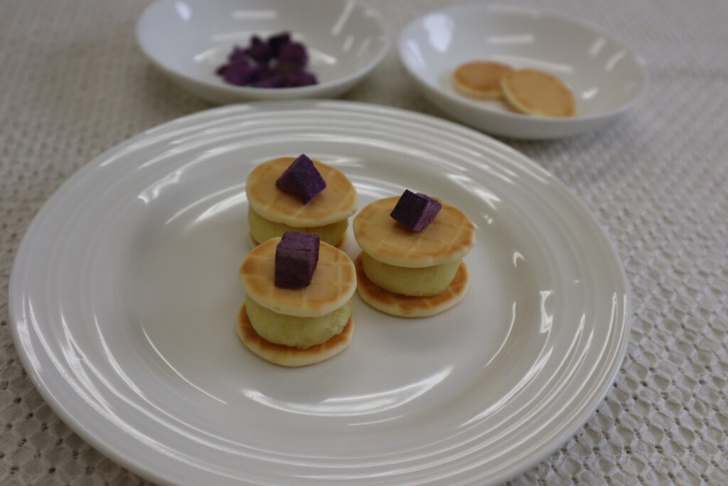 たまごせんべいで上下を挟んで完成。サクサク食感と真ん中のモチっと感、さつまいもとたまごせんべい2種類の優しい甘みがWで楽しめます!
