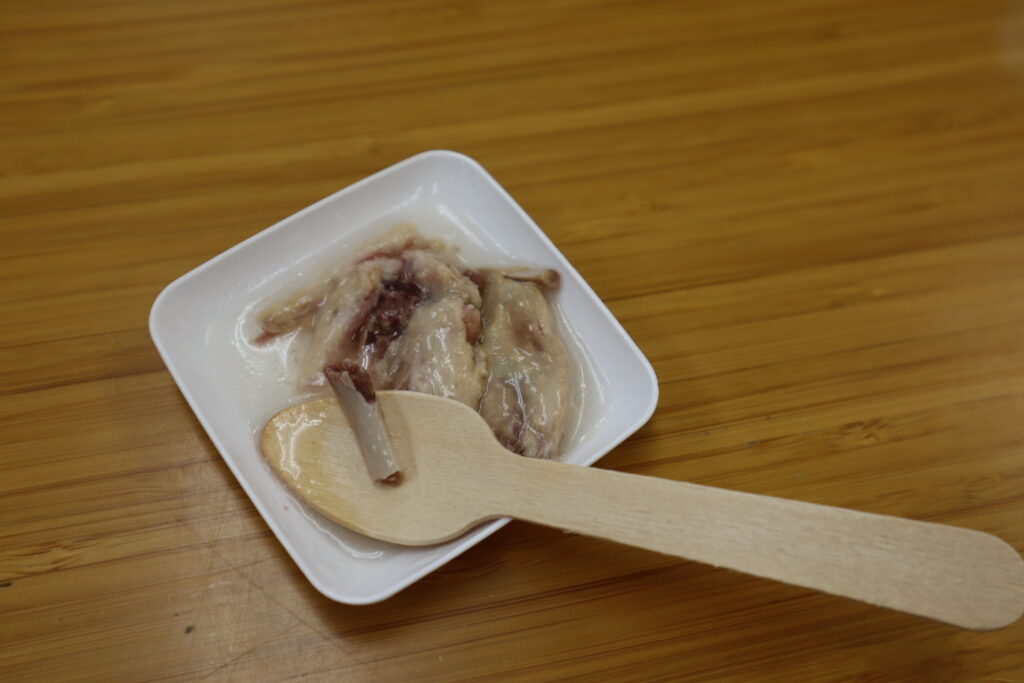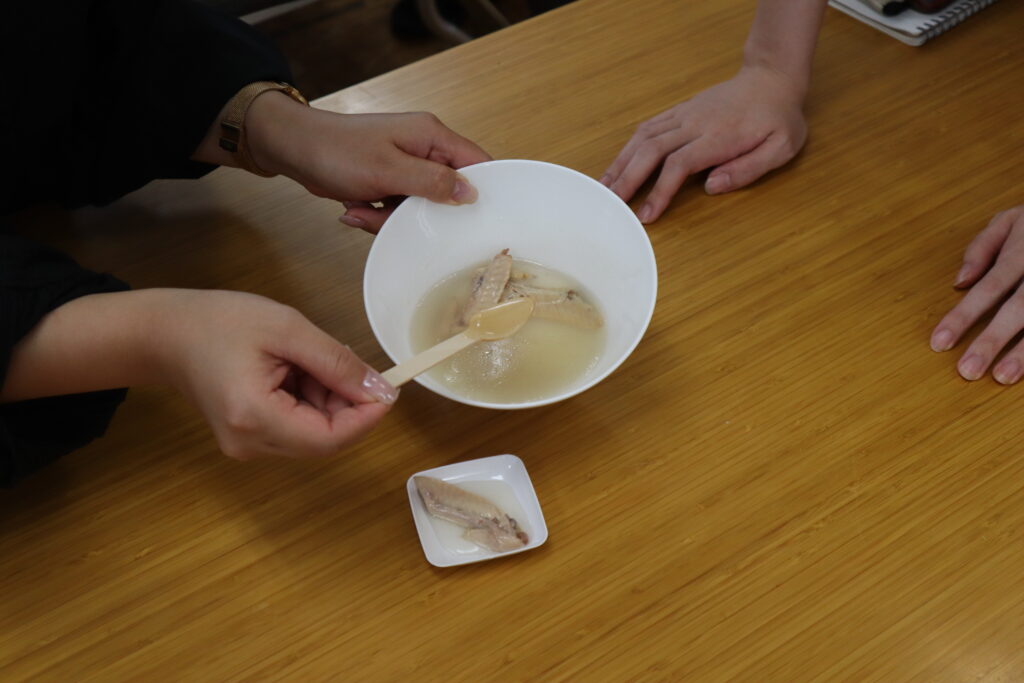 しっかりとした形の手羽先を目の前にして、「本当に骨まで食べられるの?」とドキドキするスタッフ。