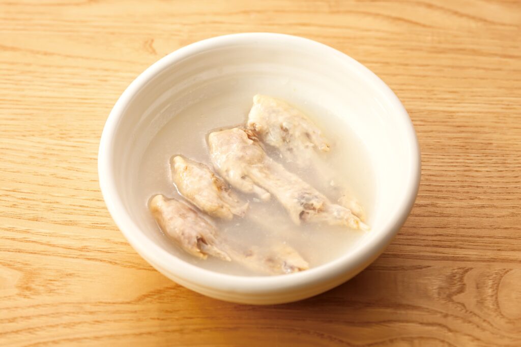 その結果、肉質が硬くなったり、旨みが逃げてしまう原因になるため、手羽先はしっかりと解凍してから下ゆでしています。
