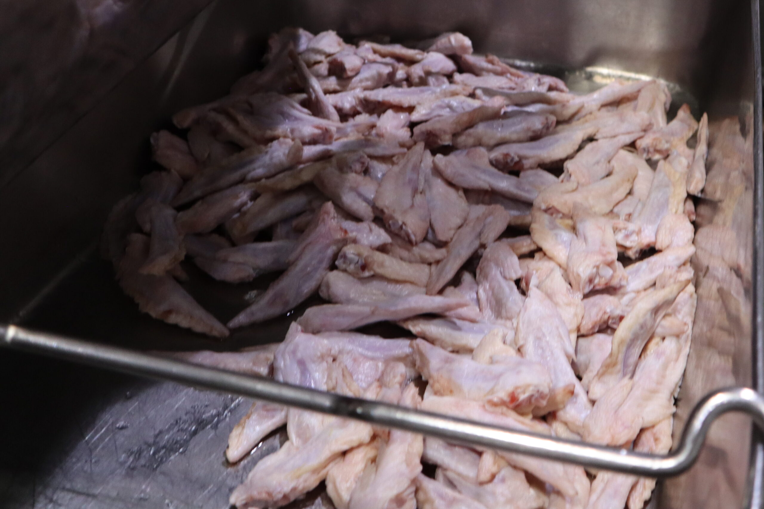 生産工場に届く手羽先は、鮮度を保つために冷凍された状態で運びこまれます。