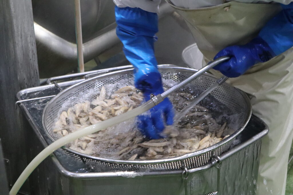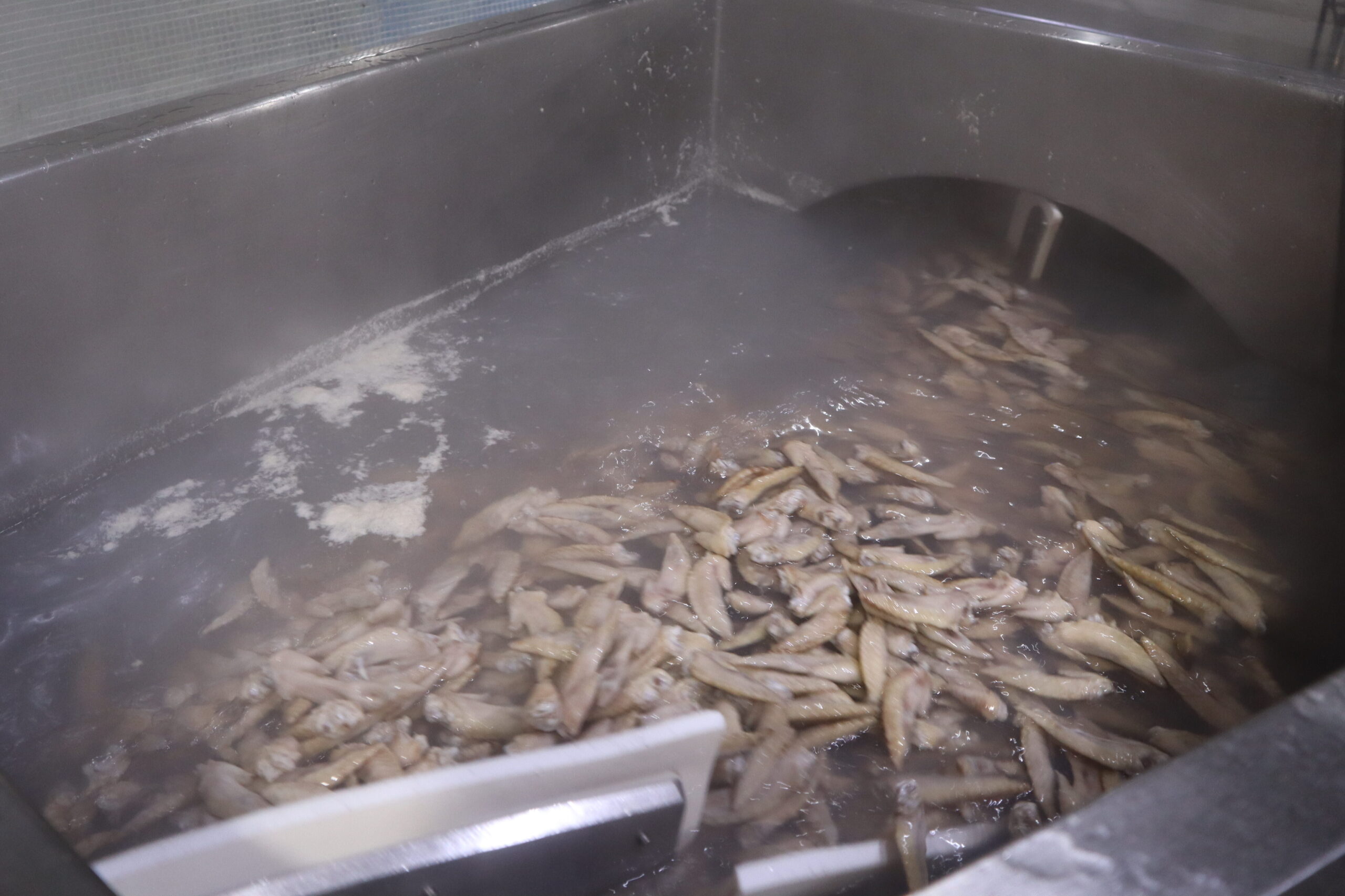 ボイル後には、手羽先を少量ずつわけ、手作業で丁寧に冷水洗浄を行います。