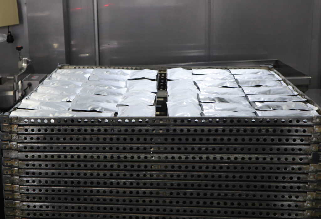 【加熱】と【加圧】の工程が終わると、風圧機でレトルトパックについた水滴を勢いよく吹き飛ばします。