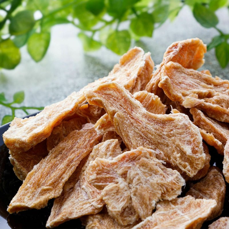 与えやすいサイズと固さにするため、加工職人によって独自の技術で丁寧に薄切り。その後、低温風でじっくりと乾燥させました。機械任せにせず、食材の様子を見ながら時間や温度を調節することで、香ばしく、サックリとした食感に。また、含水量を10%以下にまで下げることで、保存料を添加することなく1年の保存期間を実現しています。