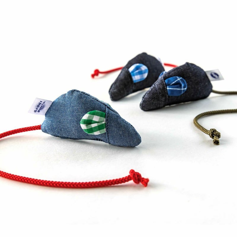 クラフトマンシップの塊であるジャパンブルーさん、ハギレネズミという降って湧いた新しいアイデアに、使い手であるネコちゃんの目線から工夫を重ねてくださいました。例えば、ネズミをくわえた時の安全性を考慮し、あえて目はつけない。あるいは、しっぽ部分を長くすることで動きを引き出し野生本能をくすぐるなど。こうしたネコちゃん目線は同時に飼い主さまの安心感や一緒に遊べる楽しさにもつながります。面白がりながらも真面目に真摯に考えてくださった結果、世界に誇る児島産デニムのネズミが誕生しました。