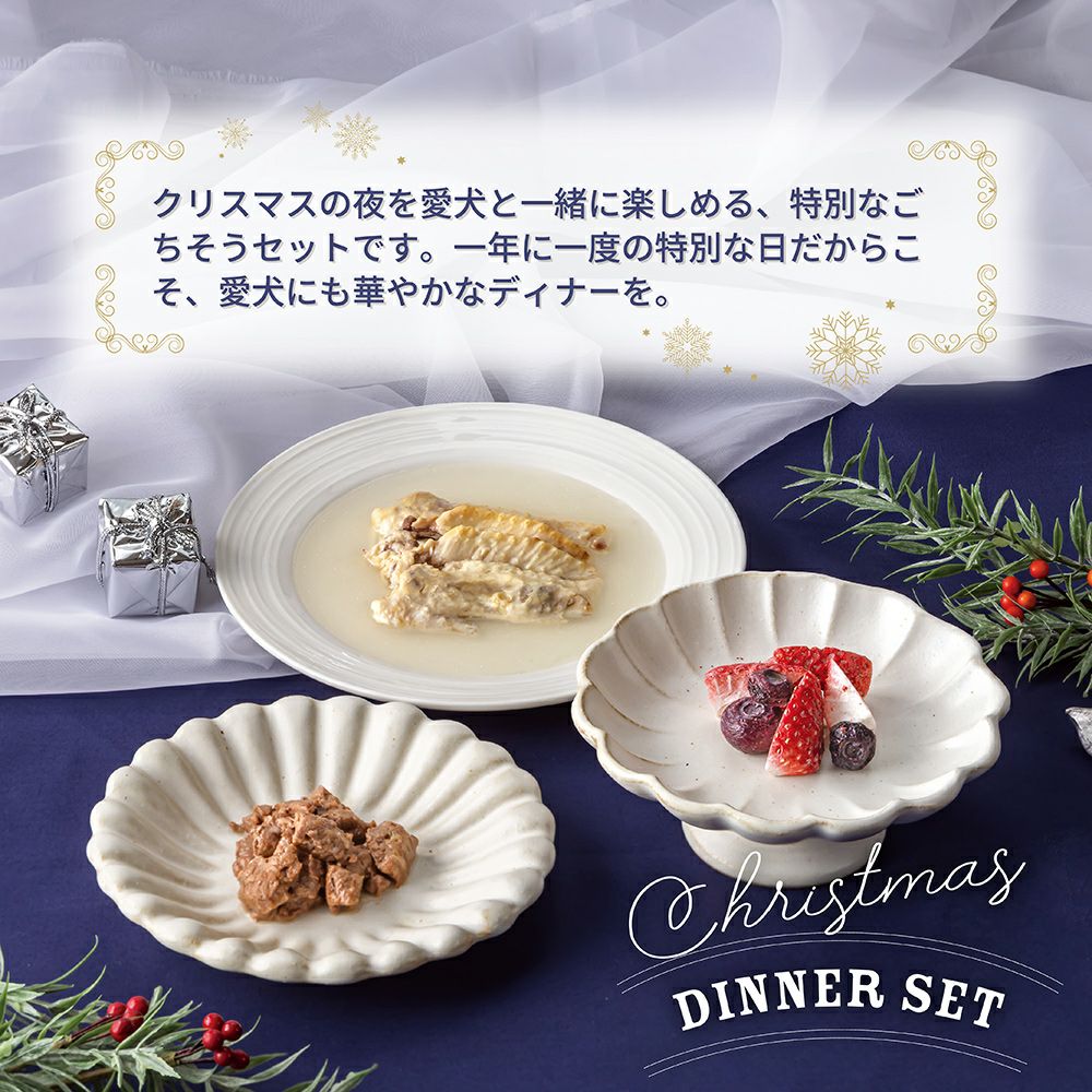 他の画像を見る 期間限定 ドットわんクリスマス2025 ディナーセット ¥ 2,090 税込 販売期間 2025/11/01 10:00 〜 カートに入れる お気に入りに登録する (0) クリスマスの夜を、一緒に楽しめる愛犬のための特別なごちそうセット