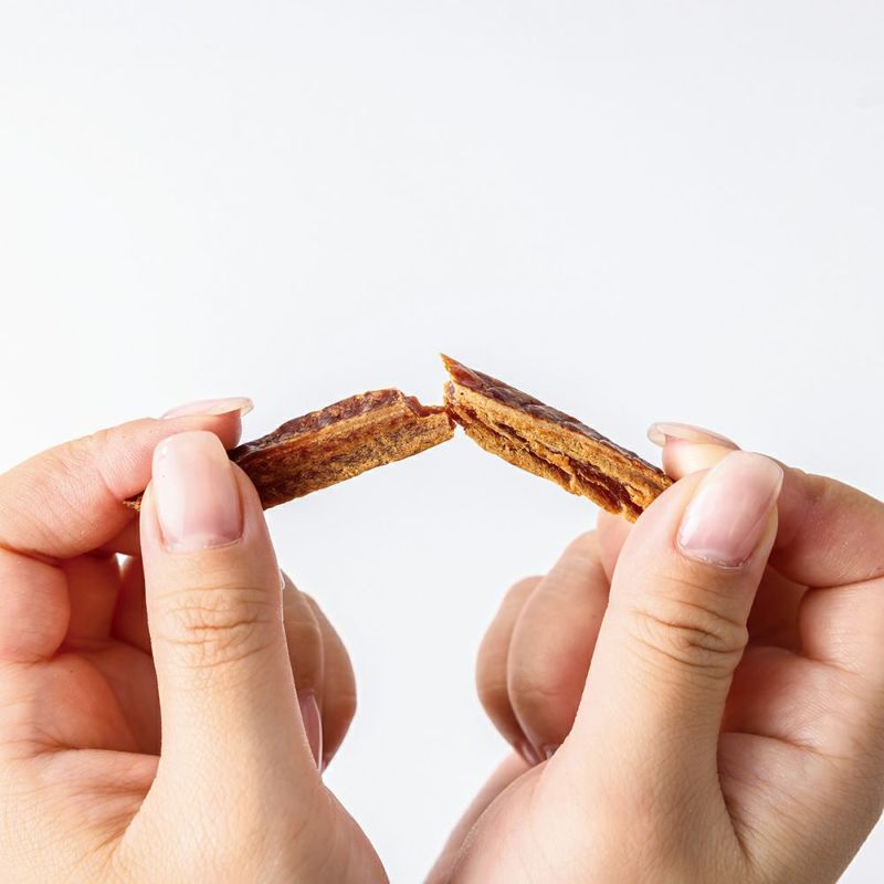 しっかりと手に持ち、奥歯で少しずつ噛ませるようにして与えてください。