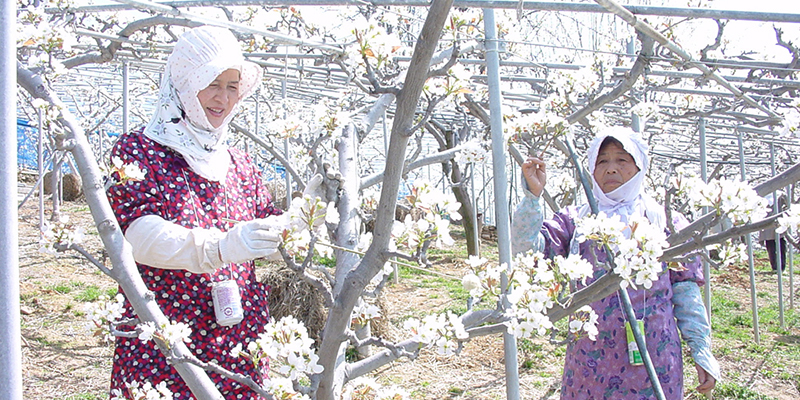 肥料に含まれる乳酸菌の働きで土中の微生物のバランスを整える「減農薬乳酸菌栽培」を採用しています。受粉や袋つけ、収穫まで全て手作業で行っています。
