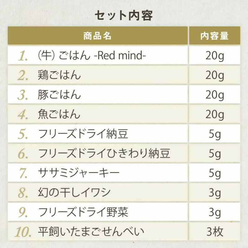 総合栄養食の「ごはんシリーズ」と肉・魚・野菜などのバランス良い「トッピング」を合計10種類お試しいただけます。