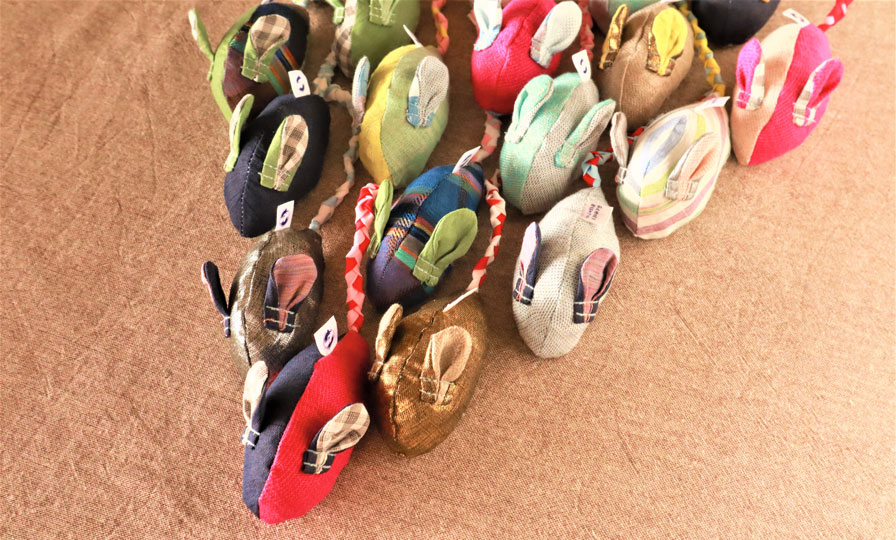 実はぬくもり工房さん、デザインや販売を専門にする会社さんなので、はぎれや残反など未利用繊維はそんなにたくさん出ません。しかし、産地では大量に廃棄せざるを得ない生地を持て余しているところも多いとのこと。「産地の継続と発展」をビジョンに掲げている会社として、廃棄を減らしつつ産地をアピールできるこだわりのネズミを模索。何度も試行錯誤を重ね、遠州綿紬のあたたかみのあるはぎれネズミが誕生しました。