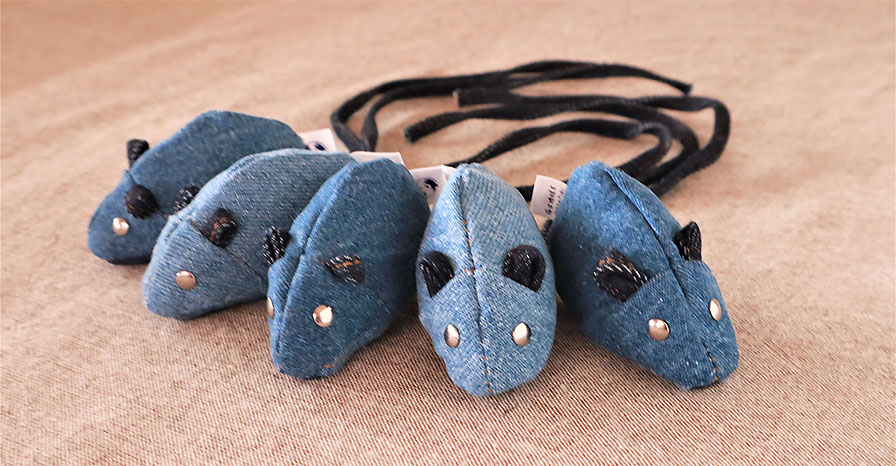 井原は昔ながらの草木染めや備後絣の伝統による藍染めを進化させデニムの染色に活かしています。また備中小倉に発する撚糸技術の伝統を現在まで受け継ぎ、デニムの生地作りにその発展した技術を活用しています。風合いのあるデニムは大量生産ではなく、その糸を使って丁寧に織り上げた反物から生まれました。 職人集団として、プライドを持って製造したデニムを、ねこちゃん、飼い主様にも感じてほしくて、井原エリアのネズミが誕生しました! 丁寧に織り上げた反物から生まれた商品だから安心・安全に遊んでいただけます!