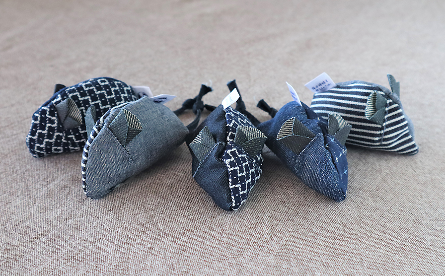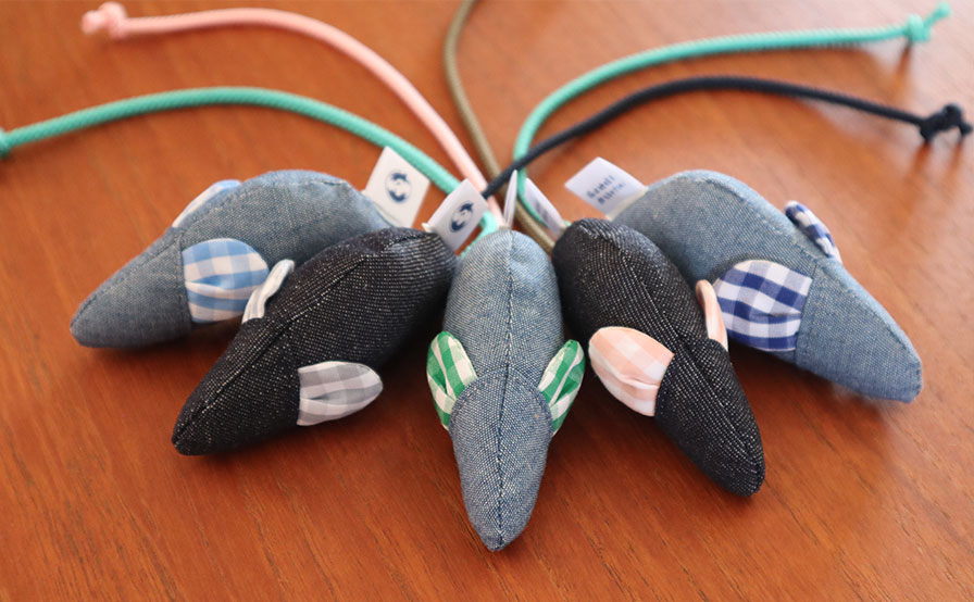 クラフトマンシップの塊であるジャパンブルーさん、はぎれネズミという降って湧いた新しいアイデアに、使い手であるネコちゃんの目線から工夫を重ねてくださいました。 例えば、ネズミをくわえた時の安全性を考慮し、あえて目はつけない。あるいは、しっぽ部分を長くすることで動きを引き出し野生本能をくすぐるなど。 こうしたネコちゃん目線は同時に飼い主さまの安心感や一緒に遊べる楽しさにもつながります。 面白がりながらも真面目に真摯に考えてくださった結果、世界に誇る児島産デニムのネズミが誕生しました。