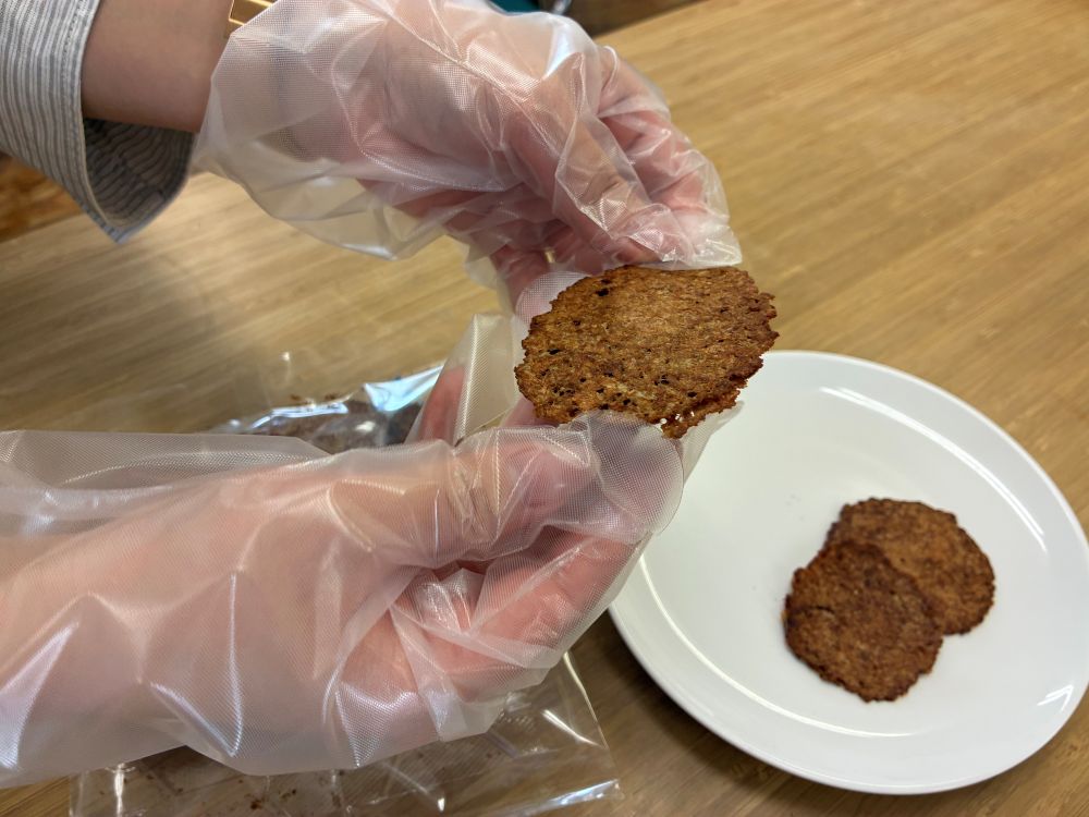 また、試作第1弾のせんべいは大きめだったのですが袋詰めの際に割れてしまうことが多かったため、お客さまのもとまで綺麗な状態でお届けできるよう、サイズは他の手焼きせんべいと同じくらいに調整いただくことにしました♪