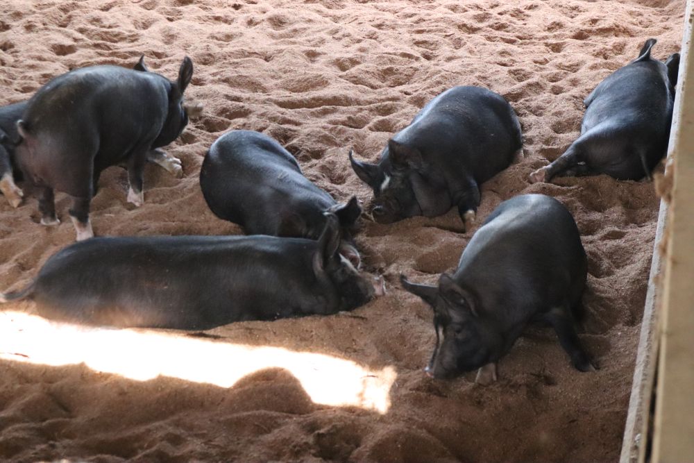 具体的には、自由に動き回れ、”豚が餌場に一列になって食べられるくらい”の密度で肥育を行っていたり、おがくずをたっぷり敷く・巨大扇風機を設置するなどによる暑さ・寒さ対策を行ったりしています✨