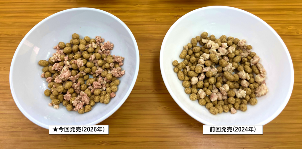 2024年の大粒そぼろだとドットわんごはんと同じくらいの大きさ、今回の小粒ミンチはドットわんごはんよりも小さくて、フードの間に入り込む感じになっています✨
